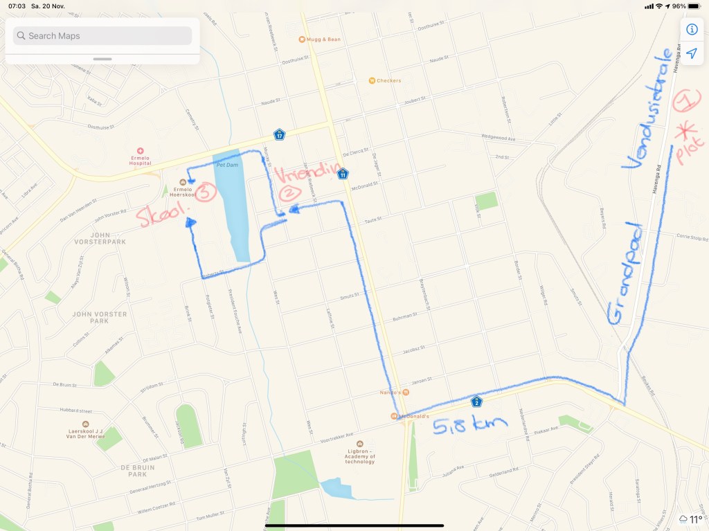 Ek het geen idee hoe ver dit is nie, maar dit was ver. Ons het ‘n gedeelte ribbebeen grondpad gery, en dan in die hoofpad tussen Camden en Ermelo afgery na die skool se kant. Met baie swaar tasse op ons fietse. Dit lyk op Google Maps of dit so 5,8 km kon wees.