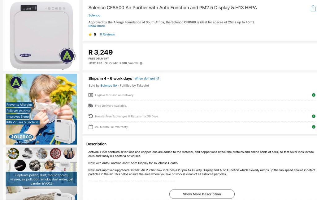 1) Die Solenco masjien: Model CF8500 Air Purifier