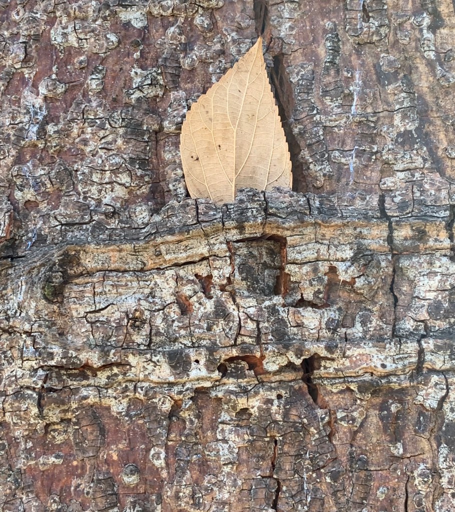 Die boom was nog nie reg om van hierdie een blaartjie afstand te doen nie. En koester dit veilig en ongeskonde teenaan haar growwe stam. So amper asof dit die presiese doel van die los deeltjie in die stam is!