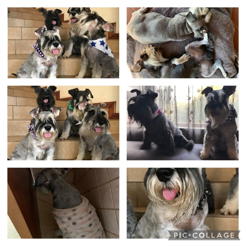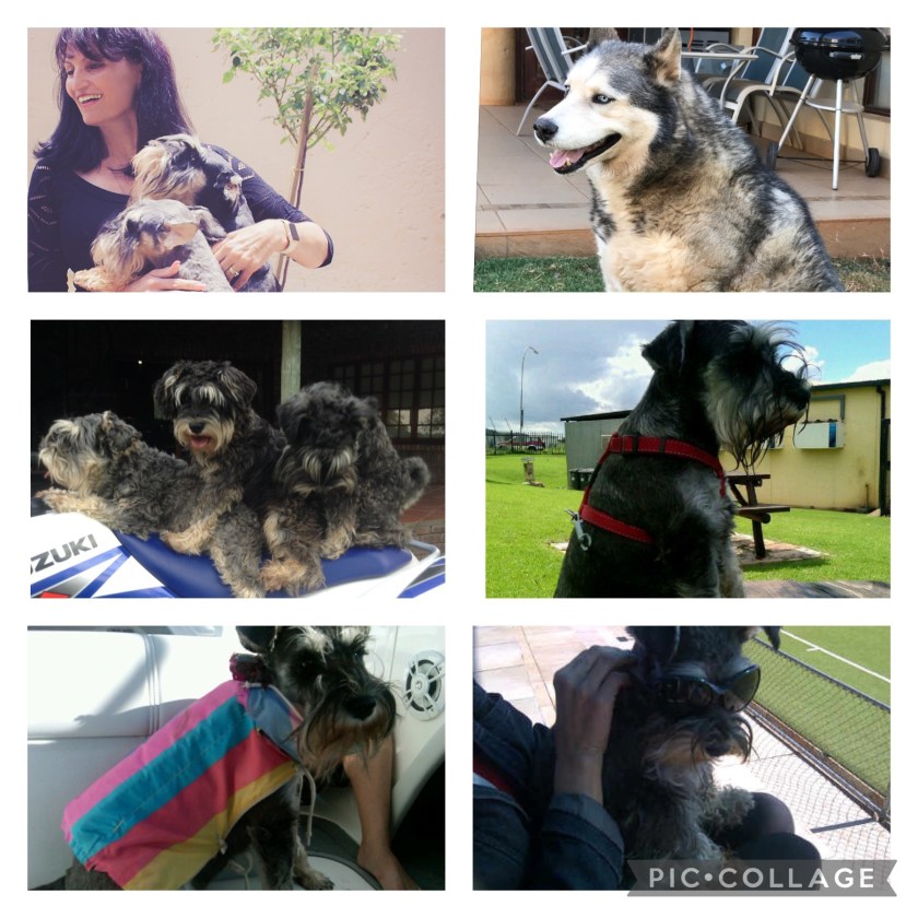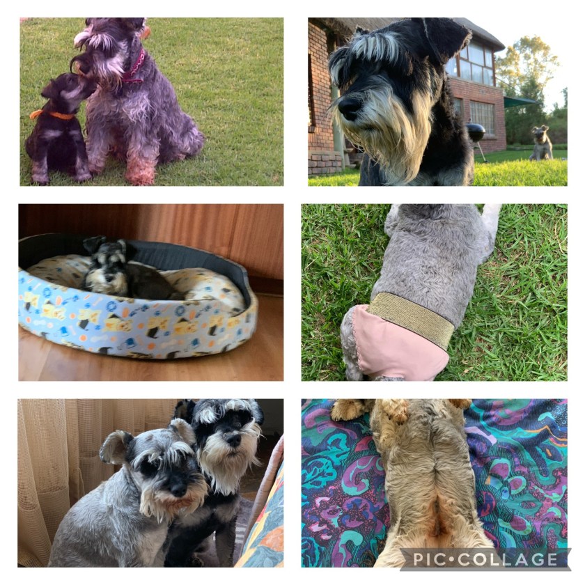 Ry 1: Ek is darem vreeslik trots op my babas, hier soentjie ek vir Silo en ek kyk van doer agter hoe mamma foto’s neem. Ry 2: Ons nuwe bed het Schnauzers op en ek moes ‘n panty dra toe ek lê dat Sobek my wond lek waar die nierstene uitgesny is. Ry 3: So lyk die kinders as ma hulle wil bad, nie happy chappies nie. En my gunstelinh posisie – op my rug in die son.