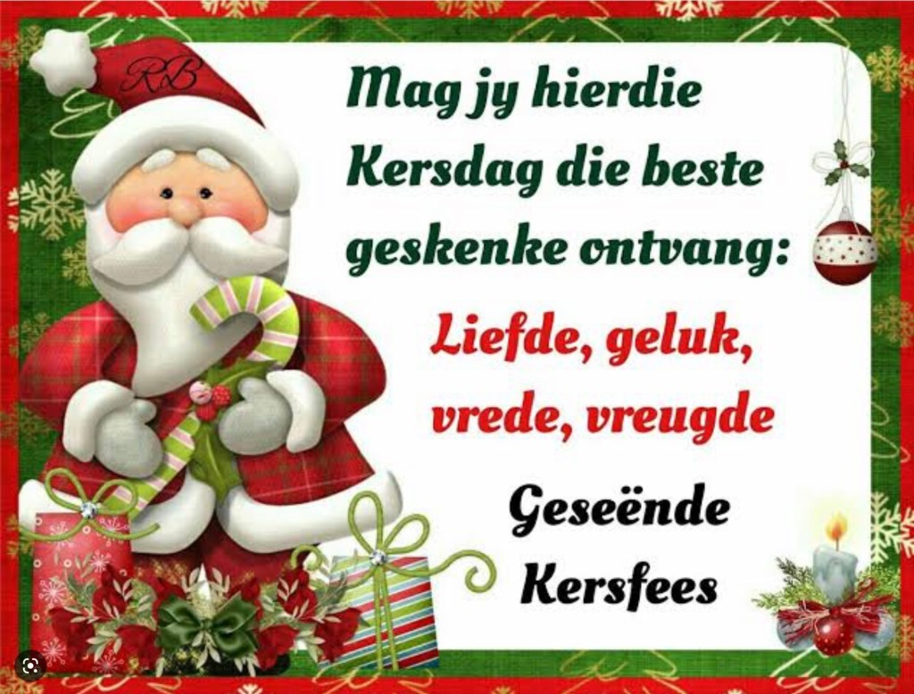 Mooi Kersdag vir jou rn jou familie. Geniet elke oomblik die saamwees. Hope liefde en stywe druk.