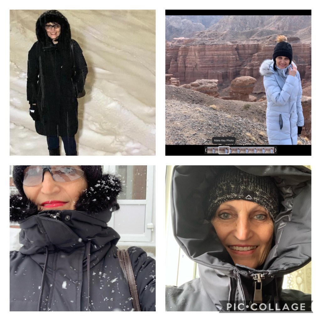 Daai fietsagtige bril het my oë beskerm, my oogballe het gevoel soos iets wat uit ‘n yskas gekom het. Op die tweede foto was ons in Maart 2019 by die Canyon, en die ysreën het my hard gepiets. Ek was gek oor beide jasse. Derde foto wys sneeuvlokkies op my badjie en laaste een help mens om te verstaan waarom karre vir voetgangers MOET stop. Met daardie gedoente van ‘n kappie kon ek nie regs/links/regs kyk nie … Hulle ry mos aan die “verkeerde” kant van die pad .. Beide jasse is al hier in Suid-Afrika gedra.