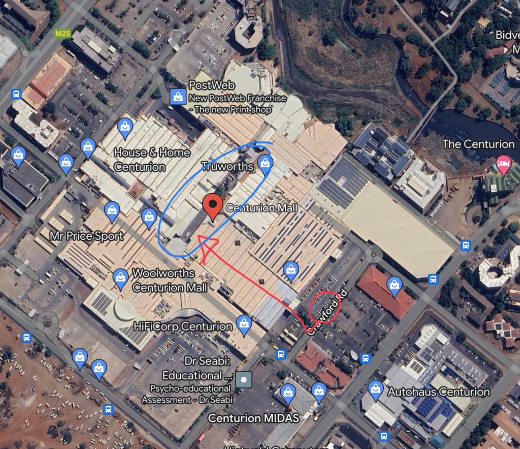 Ons het naby die ingang by Pep en Ackermans gestop, daar ingegaan, skoentjies omgeruil en in die gang deurgestap (rooi pyl op foto) na die oop gedeelte (blou gemerk op foto).