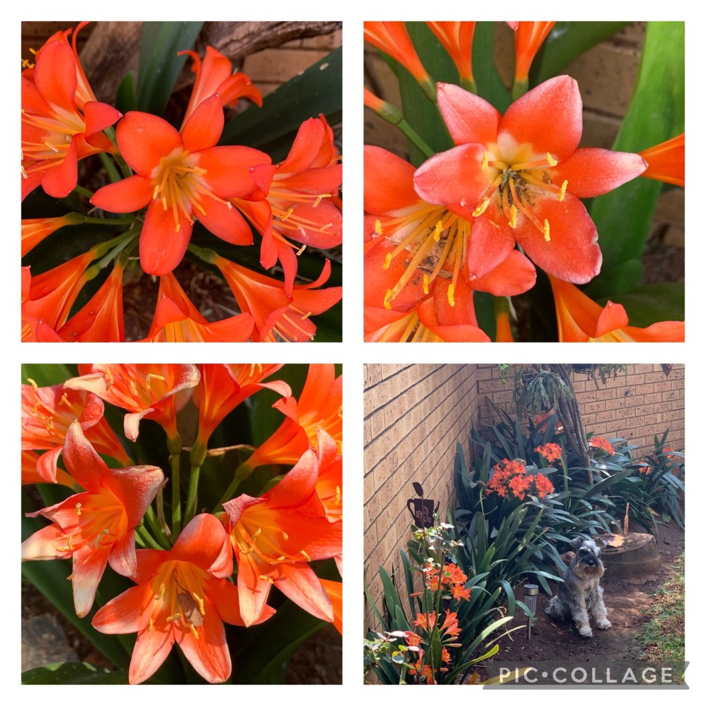 Terloops, twee van die clivias se blomme het ‘n baie sterk wit randjie, die ander is algeheel oranje. Kyk hoe lekker sit Bekka by die blomme, hulle is weer geskeer. Eerste keer nadat Shilo weg is, was so hartseer om net twee te gaan aflaai …