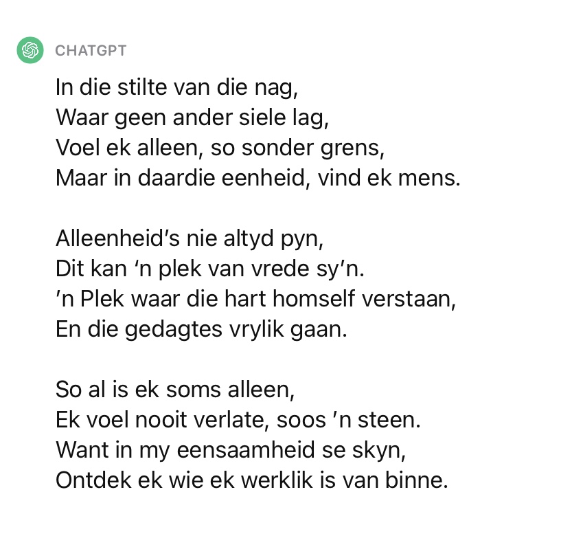 1. Daai regte skrywers is net dit, nie tegnologie kenners nie. Ek het getoes, verskeie goed, ChatGPt skryf sy eie goed. Of dit goed is, is interessante vraag. Vir my gaan dit so boetjie bo my verstand dat ‘n masjien sulke oulike gied kan skep.