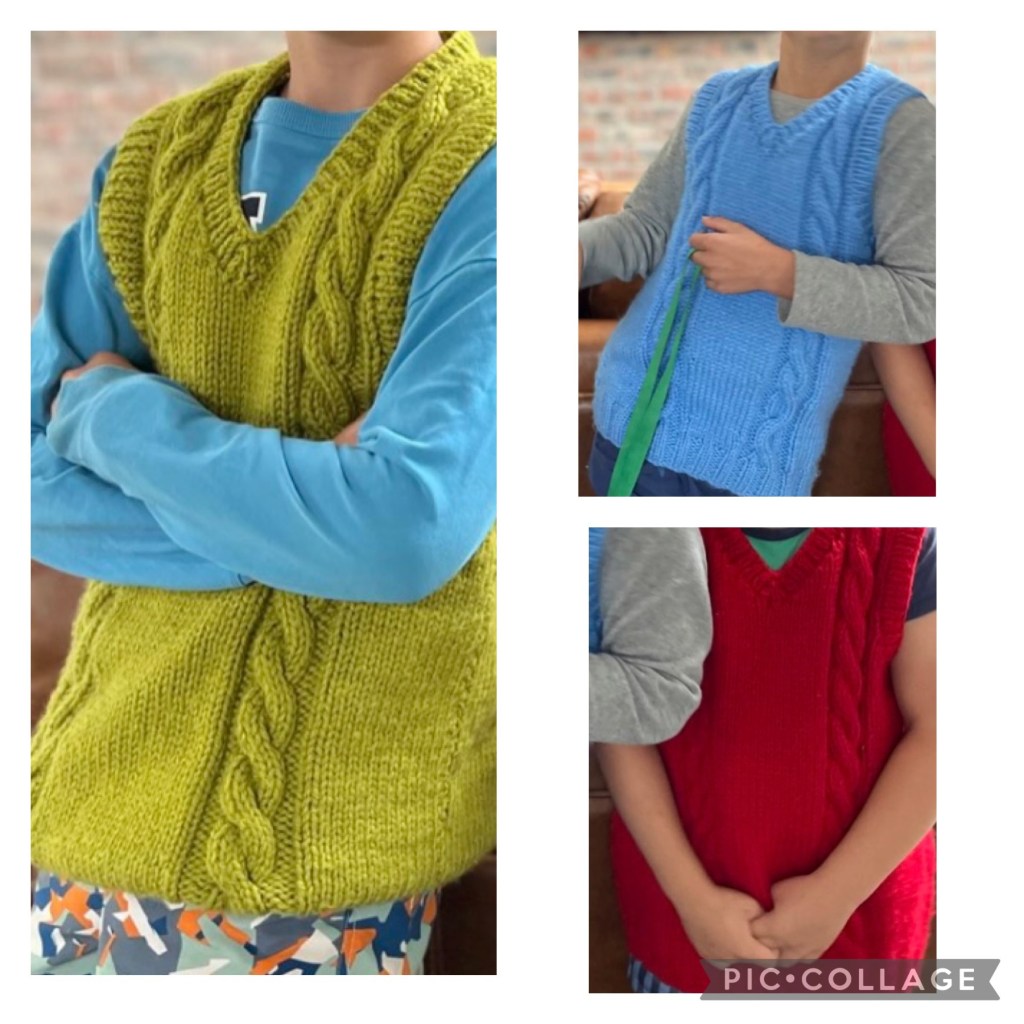 Iedergeval, my drie ander kleinseuns het in Maart by my by die see gekuier, en hulle wou toe weet vir wie ek brei. Toe vertel ek vir jongste kleinkind. Hulle was verras dat hy sommer twee truie kry, hulle het nog nooit gekry nie. En ek verduidelik toe dat ek net klein truitjies brei. En vir myself.