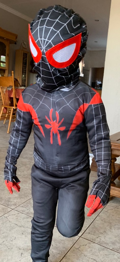 Oupa sē ons moet na partytjiewinkels toe gaan en sommer koop. Ouma weet daai gaan nie werk nie, daar is regte halloween monsters, nie iets wat ons ou driejarige moet kry nie. Maar ons gaan en koop toe sommer superman en spiderman.