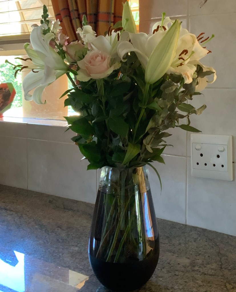 Die potjie blomme staan op my kombuistafel, manlief gaan dit dadelik raaksien as hy in die huis instap.