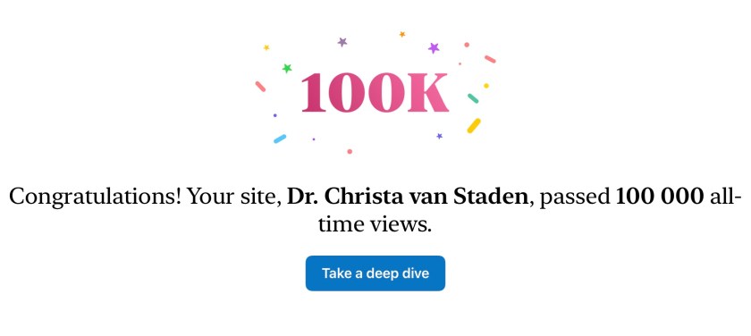 Ek kry gisteraand hierdie boodskap op WordPress, my webwerf het 100 000 kyke gekry.
